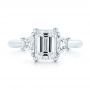 These side stones are trapezoid diamonds, which total 0.48 carats when taken together. They sit with their wider ends up against the side of the main diamond, and they taper down to the width of the band as they move away from the top. This smooths the transition to the narrower band, and it also complements the clean lines of the emerald cut while simultaneously softening its profile a bit. Three Stone Engagement Rings
