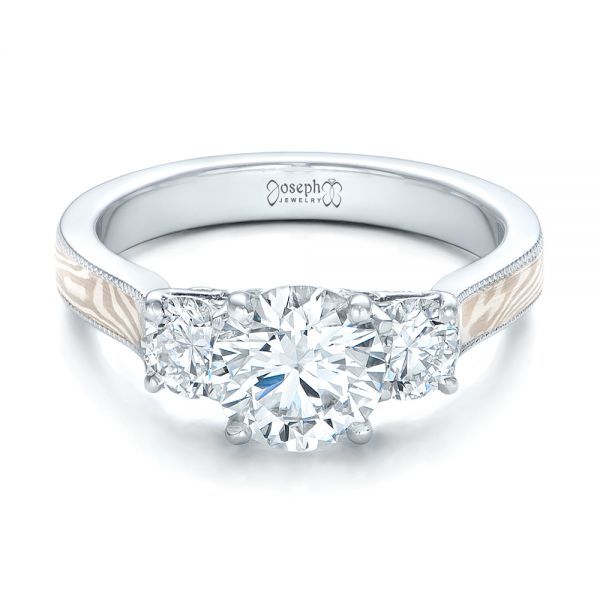This three stone ring features a round brilliant cut diamond prong set in the center with two smaller brilliant cut diamonds on its sides and filigree under the stones. The shank has a beautiful mokume pattern with milgrain along the edges.