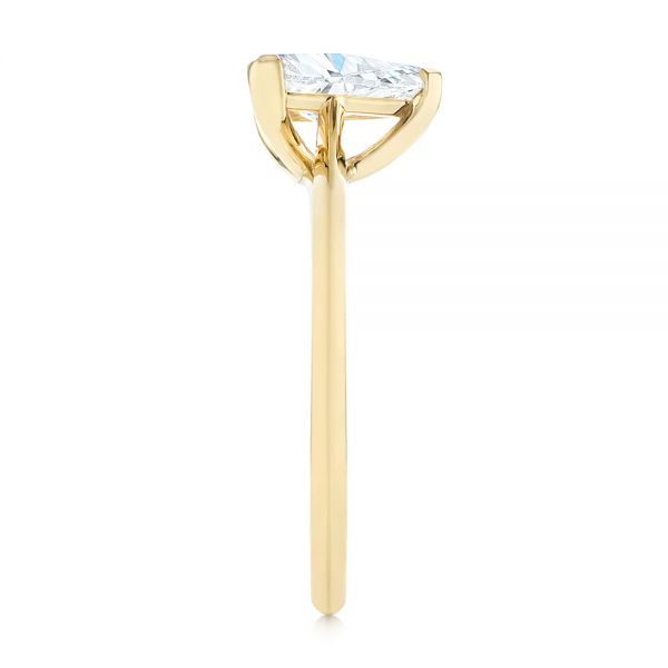 The only gemstone in this ring is a large trillion diamond. Trillions are triangle shaped with equilateral sides. The diamond is cradled in three prongs made of 18k yellow gold. They are rounded and gracefully flow down into the setting to meet at the base. Diamond Engagement Rings