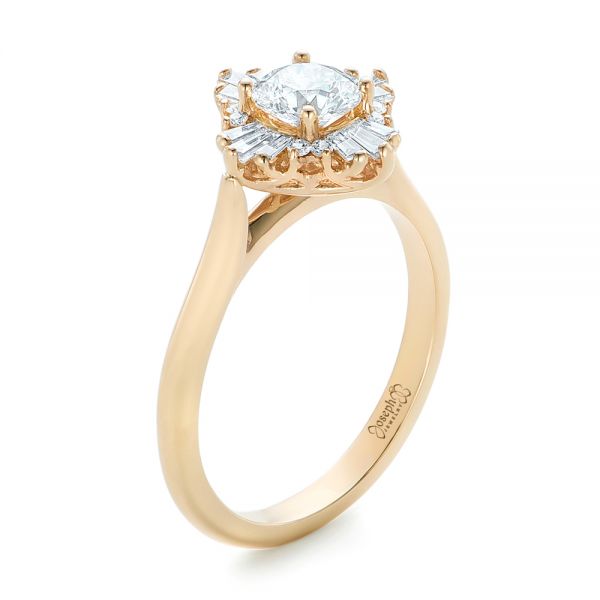 The largest diamond in this ring is a 1.01 carat Asscher cut diamond, and it’s prong set in 18k yellow gold. The diamond is rotated so that its corners sit at the compass positions, a detail that helps give shape to the entire center setting and that reinforces the Art Deco look the client was after. Diamond Engagement Rings