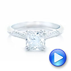 This exquisite engagement ring features a radiant cut diamond double claw prong set atop a white gold shank, accented with diamonds, sapphires, and custom hand engraving. It was created for a client from Bellevue, WA, and our team is ready to work with you to customize it any way you choose. Design Your Own Engagement Ring