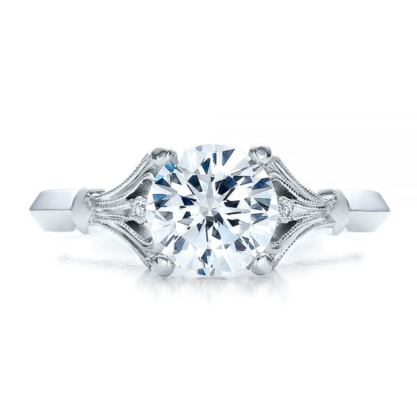 This dazzling engagement ring features a round brilliant cut diamond prong set atop a white gold knife edge shank, accented with bezel set diamonds and milgrain. It’s a unique design with vintage overtones, and we can help you customize it until it perfectly matches your vision.