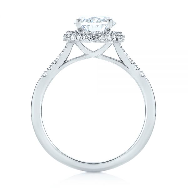 This beautiful custom engagement ring features an oval diamond surrounded by a shared prong halo and a split shank with diamonds down the shoulders, all set in white gold. It is a beautiful piece to customize to your own style, and our expert designers can help make that happen. Design Your Own Engagement Ring