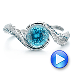 This stunning engagement ring features a blue zircon center stone with hand engraved feather detailing and blue treated diamonds down each side of the wrapped shank. It was created for a client from Nashua, NH, who wanted to achieve an organic look with their unique ring design. Design Your Own Engagement Ring