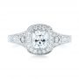 Just below the center diamond, a contoured halo of round diamonds is bright cut set, and the entire halo angles downward slightly in keeping with the curvature of the center stone. The halo style is a classic one, and the rows of milgrain beading that line both the bezel setting and the outer margin of the halo only help to intensify that effect. Halo Engagement Rings