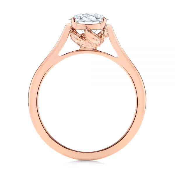 The most unique element to this ring is the basket holding the diamond. Hand-carved leaves are placed at an angle, as though they are being blown by the wind. They are textured like leaves and edged in milgrain for extra definition. The six leaves could represent a significant number to you, or our designers could add more or less. Unique Engagement Rings