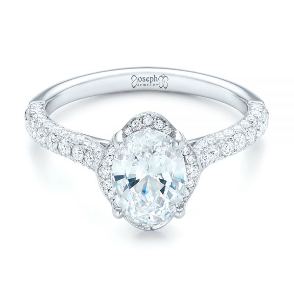 This stunning engagement ring features an oval diamond prong set in the center of a scalloped halo, with pave set diamond accents on the white gold band. It’s an elegant and glamorous design, and it can be customized in a variety of ways to better reflect your personal tastes. Whether you can visit us personally in our Bellevue, WA showroom, or you’d like to complete a project remotely via an online workroom, our team has the skills and experience to ensure you come away with the piece of your dreams. Design Your Own Engagement Ring