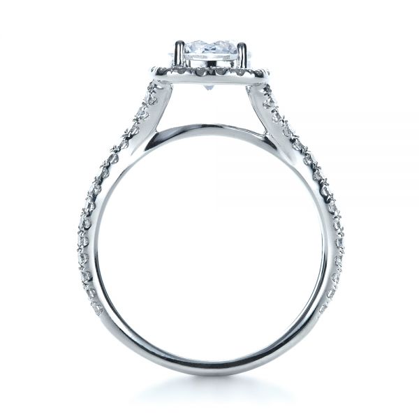 This beautiful engagement ring features a brilliant cut center diamond surrounded by a halo of split prong set round diamonds and accented by a split shank that is set with split prong set, Russian cut diamonds down the sides.