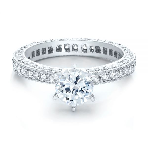This ring features a six prong set center diamond and eternity pave set diamonds on both sides and around the ring, trimmed with milgrain.