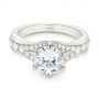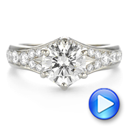 This stunning engagement ring features a round brilliant diamond center stone held in place by six trellis prongs with a small split shank and diamond accents down the sides tapering in size, all set in unplated white gold. The client started by coming into our Bellevue, WA location and trying on different styles. Then, their designer helped them narrow down and combine the different rings into one beautiful, cohesive design. Design Your Own Engagement Ring