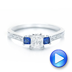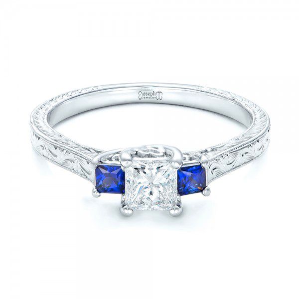 This stunning engagement ring features a princess cut diamond prong set in the center of a three-stone setting that also includes two blue sapphires. This lovely combination is accented by custom hand engraving and milgrain beading nearly all the way around the white gold shank. Its classical beauty makes it an excellent choice for use as the inspiration for your own custom engagement ring, and our team will guide you through the process to ensure you’re completely satisfied with the piece you come away with. Design Your Own Engagement Ring