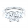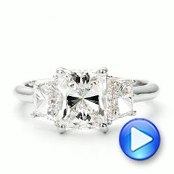 This dazzling engagement ring features a classic trellis style holding a center radiant diamond of 1.5 ctw, flanked by two trapezoid diamonds totaling approximately .75 ctw. The ring is all crafted in platinum, blending with the natural white tones of the diamonds, adding an extra charm to the overall design. The captivating radiant cut of the center gemstone spices up the classic look and gives a modern twist to it.