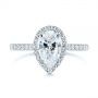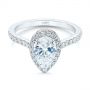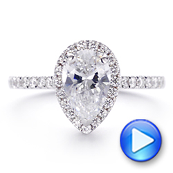 This beautiful engagement ring features a pear diamond center stone with a halo and a floral rose gold pattern underneath in the basket. It was created for a client from Bellevue, WA, who visited our showroom to view different designs and begin the custom design process. Their choice was based on a previous design that we had made with a hot pink sapphire center stone and similar detailing below the center stone. Design Your Own Engagement Ring