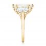 On each shank shoulder, a half-moon diamond is prong set, with its flat edge up against the side of the center sapphire. These accent stones complement the color and shape of the larger gem perfectly, and they facilitate an easy transition from the wide main setting to the narrower band below.