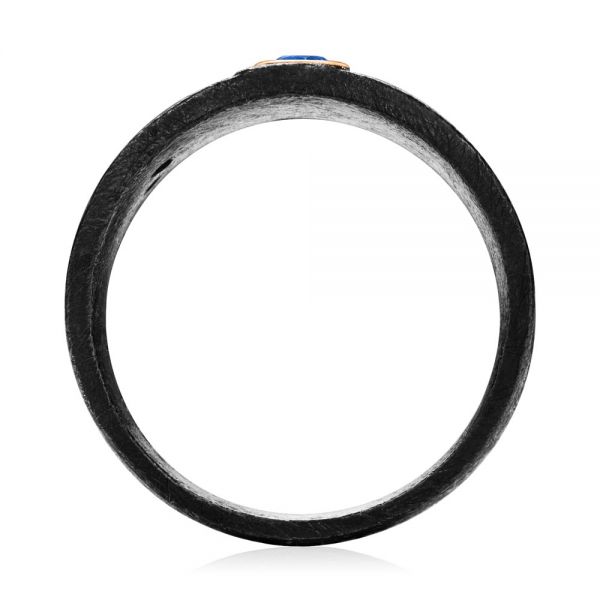 The main attraction in this piece is the color blending of different metals, brought together to create a lavish floral motif. The ring’s band is crafted from sterling silver, oxidized to reach an unparalleled rich black color. An artfully designed flower centrally stems from the ring, carefully created in platinum and garnished with a velvety blue round sapphire.