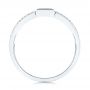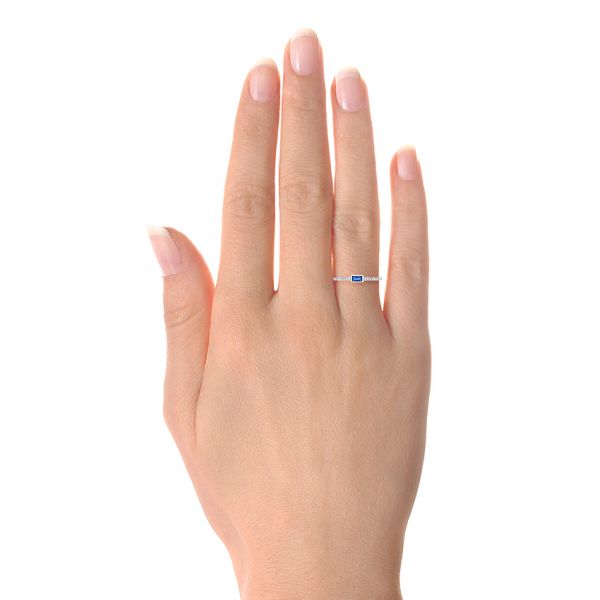 This lovely stacking ring features a baguette blue sapphire bezel-set in the center with diamonds set down the shank to the halfway point.