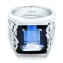 This stunning ladies’ fashion ring features an emerald cut blue sapphire channel set in white gold with small round diamond and sapphire accents integrated into the custom organic filigree on the shank shoulders. It’s a lovely contemporary design, and we can help you customize it to better suit your personal style. Design Your Own Ring