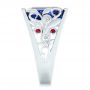 Each shank shoulder contains two small round rubies and two small round diamonds. These are bezel set in loops that extend from the custom organic filigree that fills the wedge-shaped space between the two strands of the split shank.