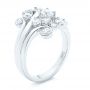 The 14 diamonds in this ring are arranged in an organic manner that makes them look like a cluster of flowers. Most of these diamonds are prong set, but a few are bezel set in the curling ends of the strands of the split shank as they wind their way through the main setting. This reinforces the organic themes of the piece, and it also gives the ring an elegant sense of balance.