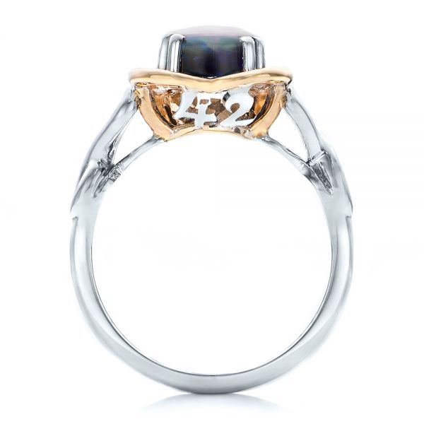 Our expert Custom Design Team created a ring that incorporated the client's wish list to symbolize love, life and the universe to his fiancee. This two-tone 14 karat white and yellow gold ring features a prong set cabochon black opal as the center gemstone surrounded by yellow gold heart shaped filigree. On the shoulders of the 14 karat gold shank are three round diamond clusters that are set in heart shaped filigree. Under the opal center gemstone is the number '42'.