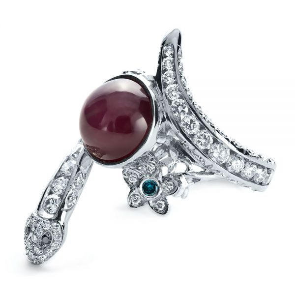 This spectacular ladies’ fashion ring features a large cabochon cut ruby bezel set at the top of a platinum band in the shape of a snake, accented by channel and pave set white diamonds, milgrain, and other organic elements. It was created for a client as a custom piece, and it can provide wonderful inspiration as you work to develop your own custom design. Design Your Own Ring