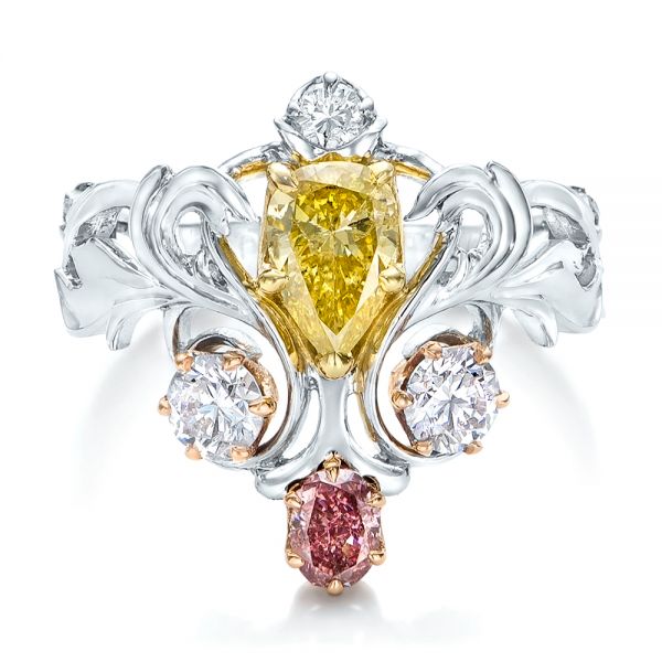 This stunning women’s fashion ring features a pear shaped fancy yellow diamond, accompanied by pink and white accent diamonds, all set in a two-tone organic shank. It was created for a client from Mount Joy, PA, who first picked out the stones she wanted, and then asked us to design the perfect piece to display them.
