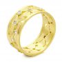 This charming ring is crafted of 18k yellow gold, with flower motifs contouring the band all along and sitting in between two golden rails. Each flower is adorned by a bezel set diamond melee, adding glitter and glam to this artful piece. For extra detail and charm, the gold surface is brushed and lightly textured.