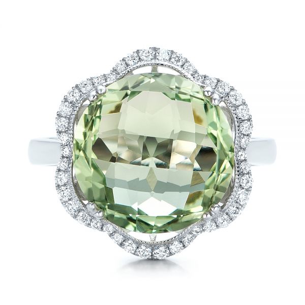 14k White Gold Green Quartz Checkerboard And Diamond Halo Ring