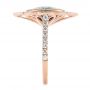 This unique fashion ring features a London blue topaz in the center surrounded by milgrain and a modified halo. It was created for a client from Bellevue, WA, based off of previous pieces made from the same topaz and rose gold theme. The center topaz stone in this piece is 9x9 millimeters and cushion cut. The total diamond weight is .68 carats. It is an elegant piece that would be a lovely gift or a starting point for a custom design. Fashion Rings
