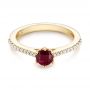 This lovely fashion ring features a red ruby in the center held by six prongs with diamonds down the shoulders of the ring to the halfway point. It could be customized in many different ways: the center stone could be a different shape or size, or a different gem altogether. We can create this ring in any metal choice and also customize the accent gems in any way. Setting a blue sapphire in the center with white gold would completely change the look from vintage to modern. Design Your Own Ring