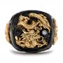 On the top of the ring, an ornate dragon is depicted in relief in carved 14k rose gold. This adds dynamic character to the piece, and the contrast between the rich black of the band and the warm shine of the metal helps highlight the exquisite detail on each section. Another rose gold figure sits on each shank shoulder, with a sleeping fox on one side and a sleeping lion on the other. Fashion Rings