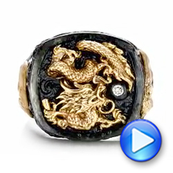 A 0.05 carat round diamond is bezel set in sterling silver on the top of the ring, off to the side of the dragon. This adds a glamorous sparkle, as well as another color dynamic to the design, and it brings along a mystical quality as well. To clarify the details of the carved gold figures further, sandblasted and polished finishes are both utilized.