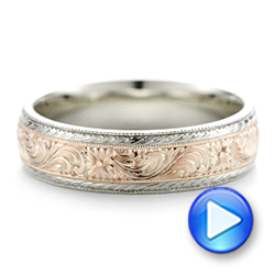This elegant men’s wedding ring features a two-tone band made from a combination of rose gold and unplated white gold, and covered with custom hand engraving. The design was developed for a client from Port Townsend, WA, who initially came into our Bellevue, WA showroom to look at some pieces and get a feel for what he wanted. He then communicated with our staff online to finalize the details of his piece, and once he gave his approval, we moved it into production.
