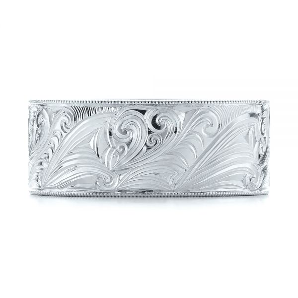 This stunning men’s wedding ring features a beautiful hand-engraved pattern on both the top and fronts, which is accented with milgrain beading. It was created as part of a custom wedding set to match a similar women’s wedding ring for a local couple who came into our Bellevue, WA showroom personally to learn more about the custom design process.