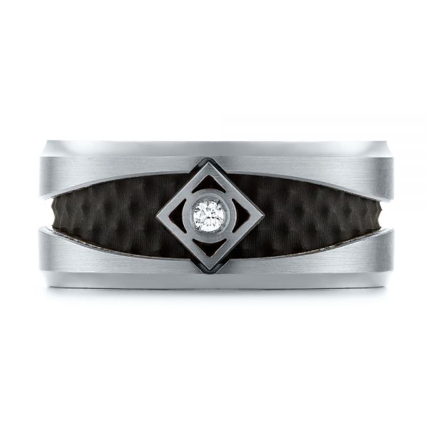 This ring features a diamond set in the center with a carbon fiber inlay and brushed finish white gold.