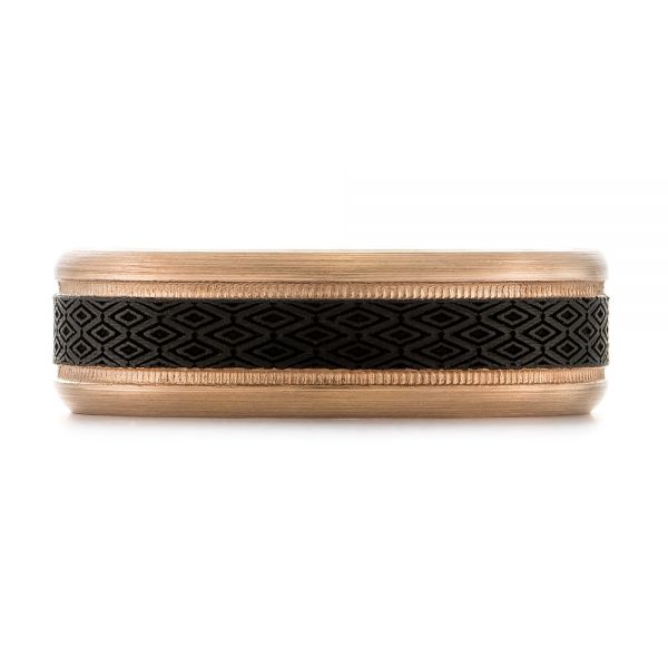 This ring features a brushed finish rose gold band with reverse milgrain and a patterned carbon fiber inlay.