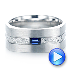 This elegant men’s wedding ring features a blue sapphire flush set inline with a section of custom hand engraving, and a light brushed finish on the rest of the white gold band. It was created for a client from Seattle, WA as part of a custom wedding set that also included the women’s rings. Design Your Own Wedding Ring