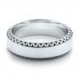 This men's wedding band has a polished center with machine engraving and black antiquing around the edges.