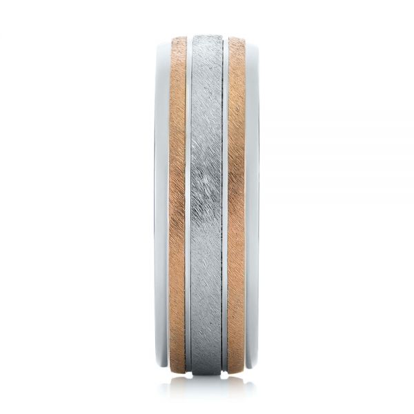 This ring is primarily composed of 14k white gold, although two lines of 14k rose gold run all the way around the band on its top surface. These two lines are part of the raised center section, and they border the wider white gold section in the center. The white gold and rose gold portions of the center are separated from each other by narrow grooves, and on the outside of the rose gold sections are polished step rails.
