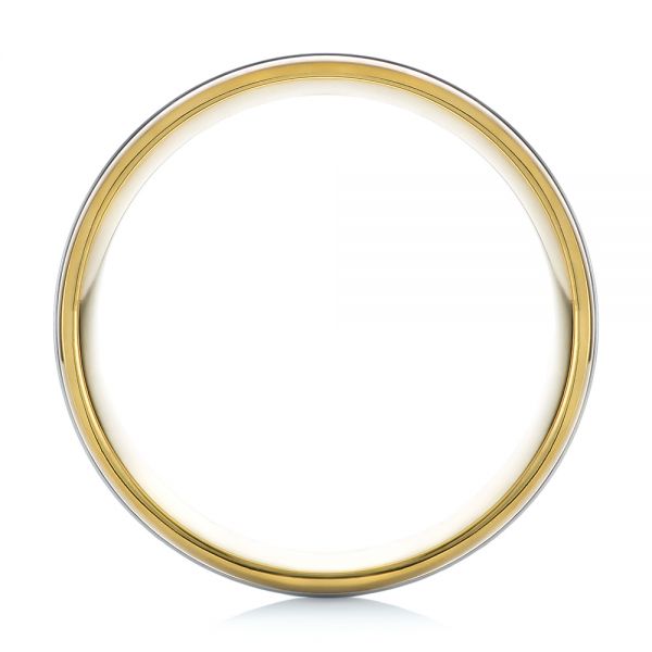 The main body of this ring is 14k yellow gold, and the band itself is 8mm wide in total. The top surface, however, is dominated by a 14k white gold inlay that runs all the way around the ring and that leaves only narrow yellow gold rails visible when the ring is viewed straight on from the top down. Men’s Wedding Bands
