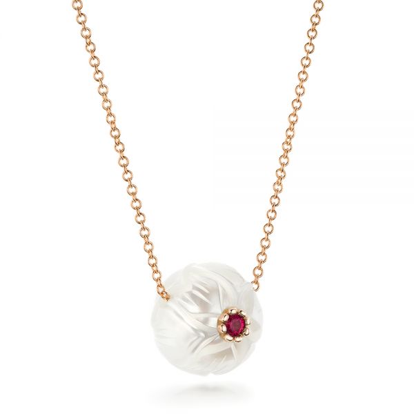 14k Rose Gold Lotus Fresh Water Carved Pearl And Ruby Pendant