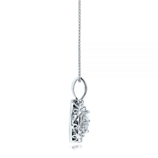 This elegant pendant features a round brilliant cut diamond surrounded by a double halo of bright cut set diamonds and accented with hand-made filigree. The design was developed in consultation with a client from Carmel, IN with whom we have worked on several custom projects over the years. He had us create this pendant as a special gift for his wife, and the delicate and intricate design elements included make for a truly classic look.