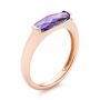 The centerpiece of this pendant is a 1.40 carat amethyst with an elongated cushion cut set in 14k rose gold. The stone is oriented to lie lengthwise between the two sides of the chain when worn, and this arrangement brings a decidedly contemporary feel to the design. The sides of the partial bezel setting holding it in place wrapped around the shorter ends of the stone, leaving the sides open to light.