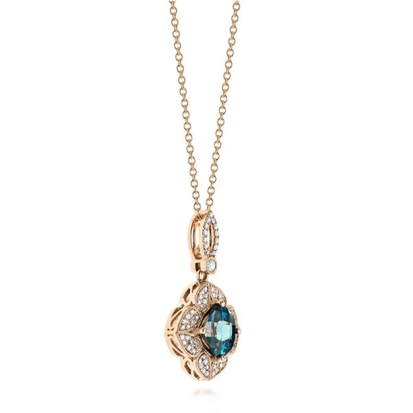 At the center of this design is a 1.75 carat cushion cut London blue topaz, and it’s prong set in 14k rose gold. The prongs holding the stone meet it at its rounded corners, which are rotated to sit at the compass positions. This arrangement gives the pendant its somewhat star-like shape, which also brings a satisfying balance to the design overall. Pendants
