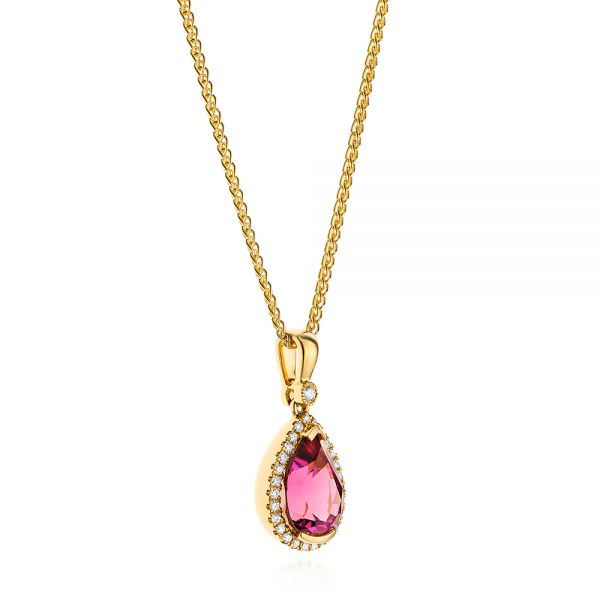This exquisite pendant features a pear-shaped pink tourmaline surrounded by a diamond halo, all set in yellow gold.