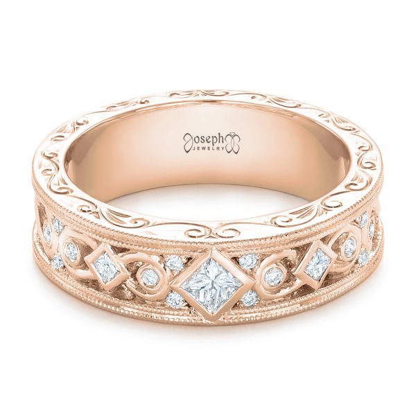 This stunning women’s wedding ring features princess cut and round diamonds bezel set in white gold, with hand engraving and milgrain accents. The design was developed for a client from Norfolk, VA, who came to us with some specific ideas about the ring he wanted for his fiancee.