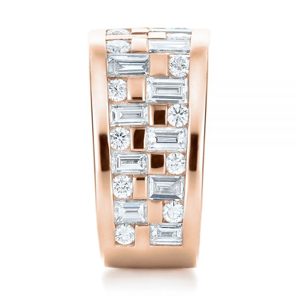 There are 23 round brilliant cut diamonds and 23 baguette diamonds set in a staggered pattern all the way around this band. These are interspersed with rectangles of platinum as well, creating a alternating design that enhances the ring’s contemporary flair. Both types of diamonds are channel set, and the polished platinum rails run along either side, framing the center section beautifully.