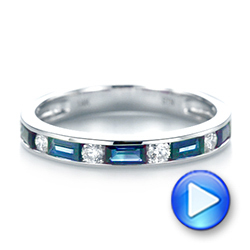 This ring features alternating channel set blue sapphire baguettes and diamonds.