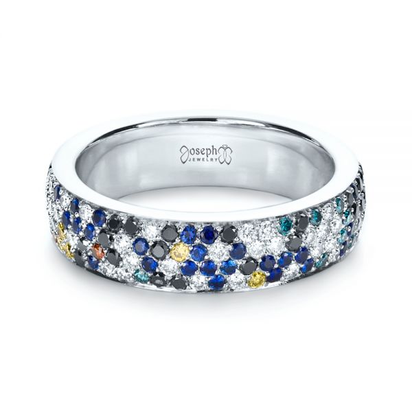 This stunning engagement band features white and fancy colored diamonds arranged in a pattern along with blue sapphires, all of which are micro pave set across the top of the platinum band. It was created as a custom piece for a client, who came to us with a clear idea of the design he wanted. It’s also a wonderful example to draw inspiration from as you begin the custom design process yourself, and our experts will work closely with you to ensure the piece we finally produce for you is perfect in every way. Design Your Own Wedding Ring