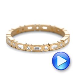 These gorgeous women’s wedding rings feature baguette and round diamonds bezel set in yellow gold in an alternating pattern, and each stone is framed with a double row of milgrain beading. They were created as part of a custom wedding set that also includes an engagement ring for a client from Salem, OR, who reached out to us online to share her vision with our team.